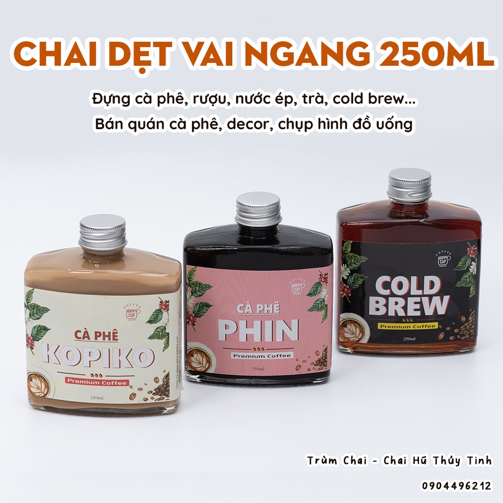 Chai thủy tinh dẹt vai ngang nắp nhôm 250ml (Chai trơn, không in hình) – Đựng cà phê, nước ép, cold brew,…