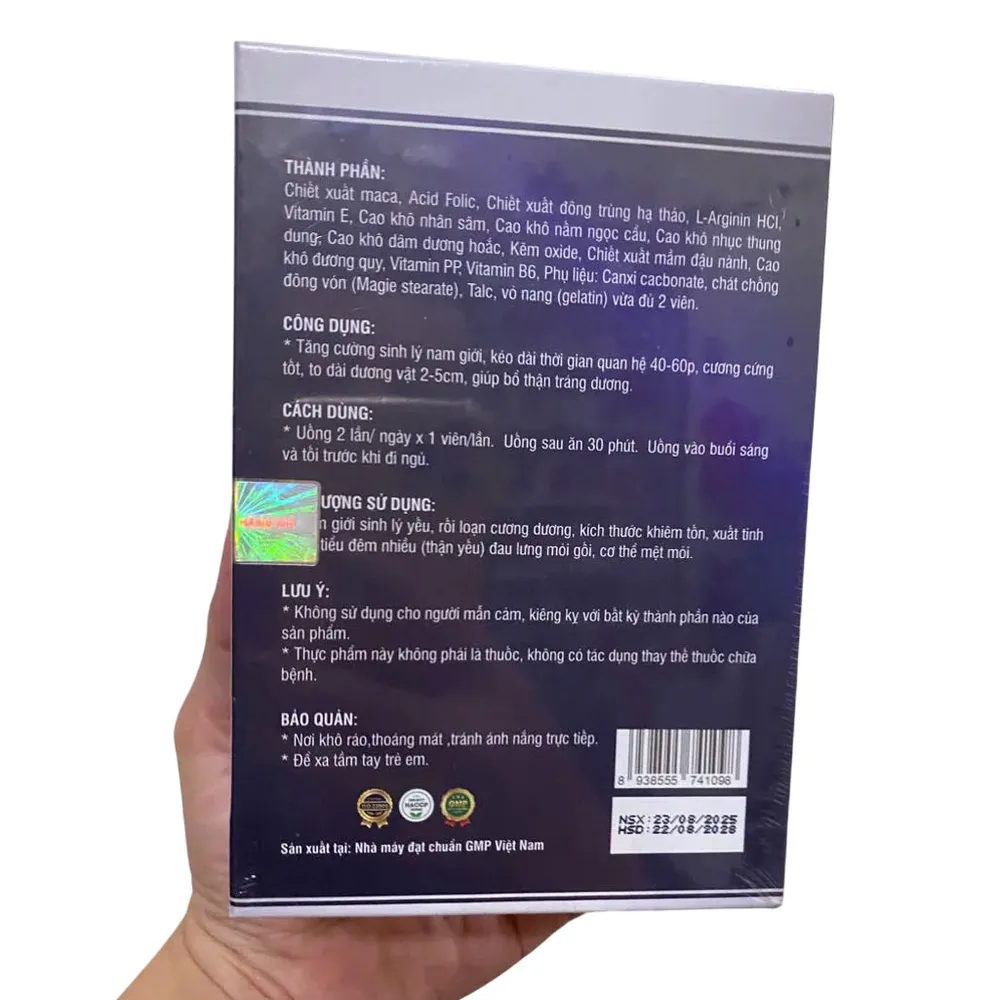 Công dụng: Hỗ trợ điều trị yếu sinh lý, rối loạn cương dương, xuất tinh sớm, tăng cường sản sinh testosterone tự nhiên, giảm mệt mỏi.